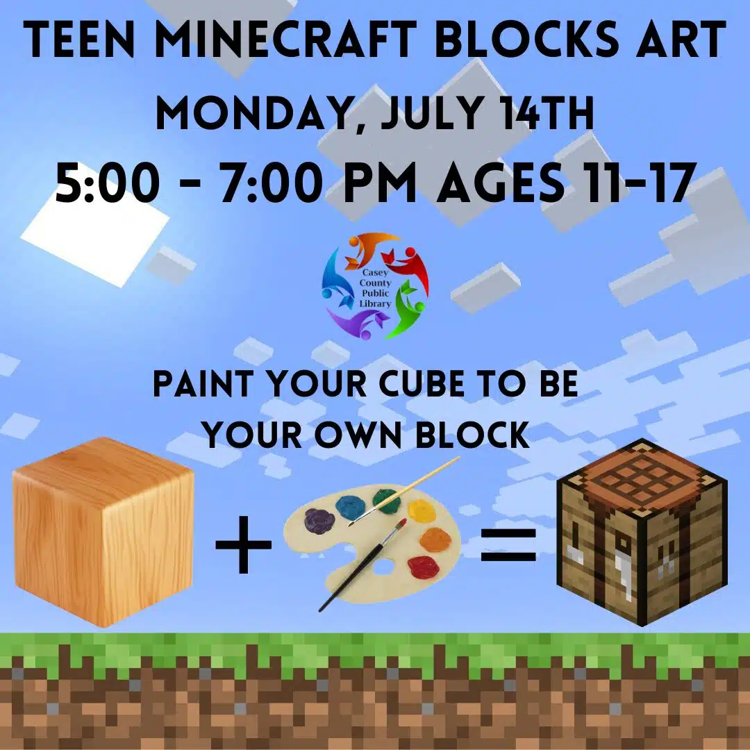 Teen Art Club – Minecraft Block Painting Jul 14 5:30 pm - 6:30 pm Tweens/Teens Teen Art Club – Minecraft Block Painting