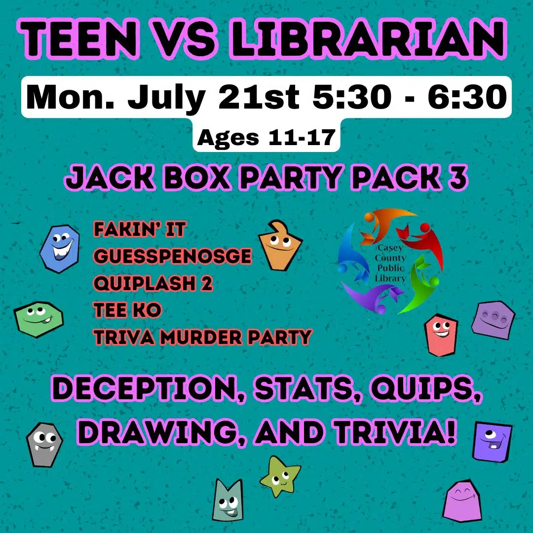 Teens vs. Librarians – Jack Box Party Pack 3 Jul 21 5:30 pm - 6:30 pm Tweens/Teens Teens vs. Librarians – Jack Box Party Pack 3