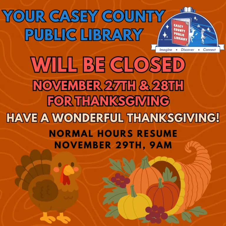 Your Casey County Public Library will be closed November 27th and 28th for Thanksgiving.