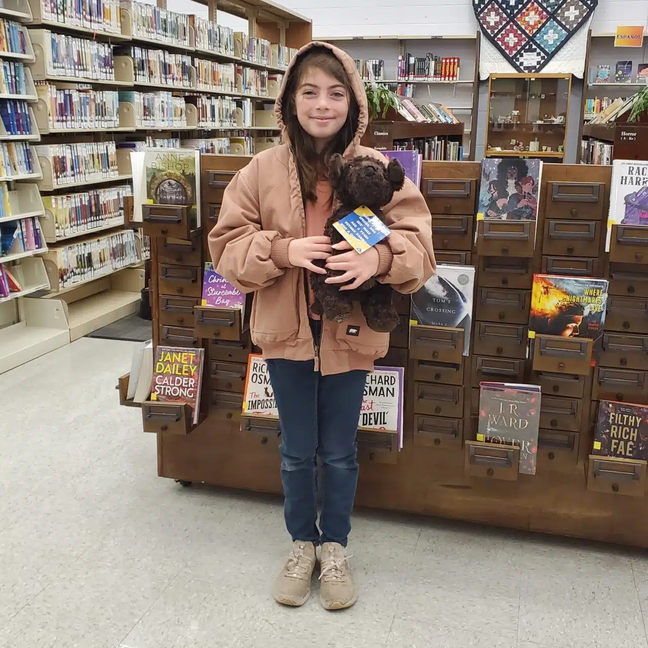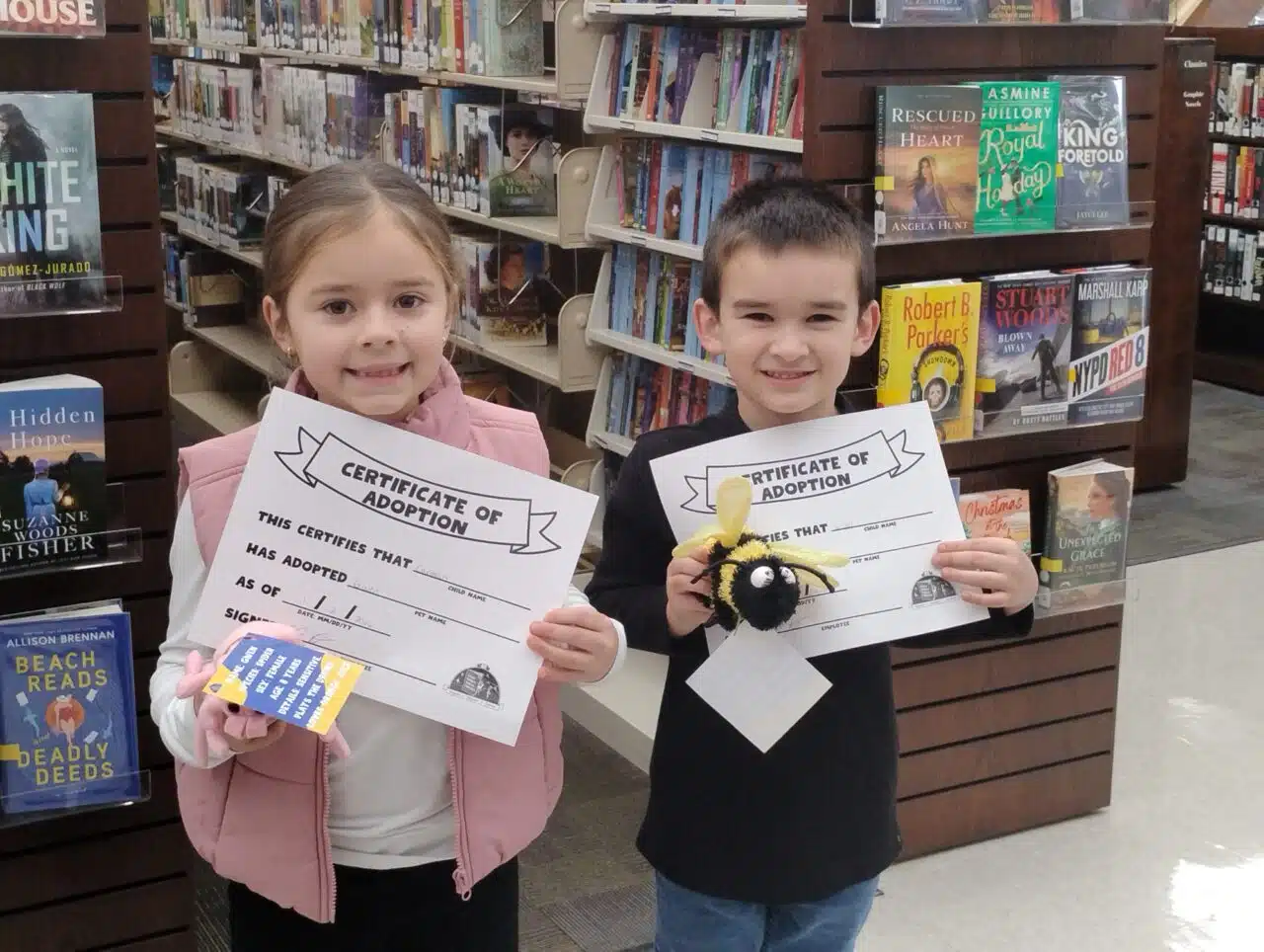 The Stuffie Shelter is located in the children’s section of the library. Each stuffie has a tag with their name, species, and a few fun facts about them. Children ages 0 – 17 are eligible to adopt a new friend — and they’ll even get a Certificate of Adoption to go with their new buddy!